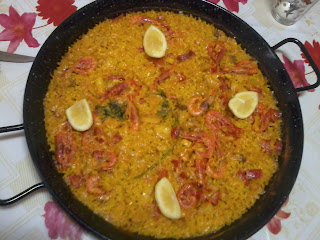 - En la paella, echamos todo lo que está en la sartén, el caldo,el pimiento que queda, el perejil y las gambas.